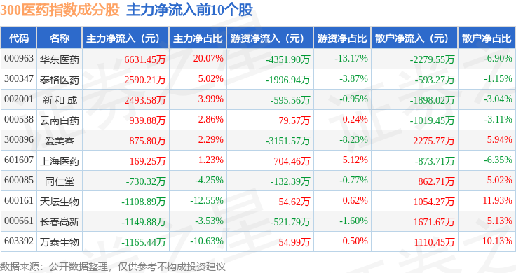 资金流向方面,300医药(399913)指数成份股当日主力资金净流出合计8.33亿元,游资资金净流入合计1.56亿元,散户资金净流入合计6.78亿元。成份股资金流向详情见下表: