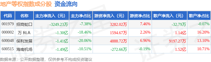 资金流向方面,地产等权(399983)指数成份股当日主力资金净流出合计4.53亿元,游资资金净流入合计9492.74万元,散户资金净流入合计3.58亿元。成份股资金流向详情见下表: