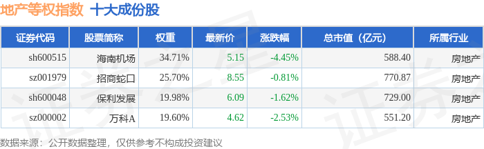证券之星消息,12月30日,地产等权(399983)指数报收于2009.25点,跌2.43%,成交32.67亿元,换手率1.5%。当日该指数成份股中,下跌的有4家,海南机场以4.45%的跌幅领跌。
