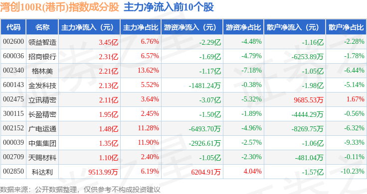 资金流向方面,湾创100R(港币)(480002)指数成份股当日主力资金净流出合计63.53亿元,游资资金净流入合计8.54亿元,散户资金净流入合计54.98亿元。成份股资金流向详情见下表: