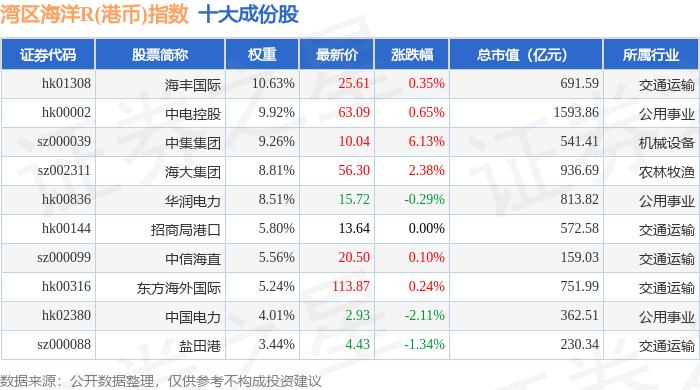 湾区海洋R(港币)(480020)指数十大成份股详情如下:
