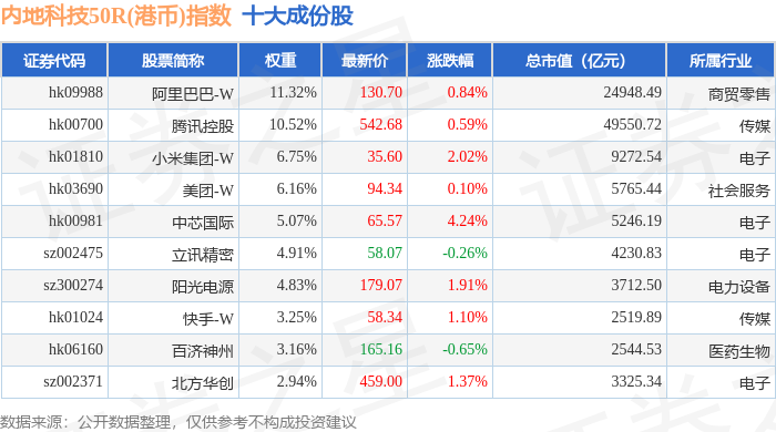 内地科技50R(港币)(483004)指数十大成份股详情如下: