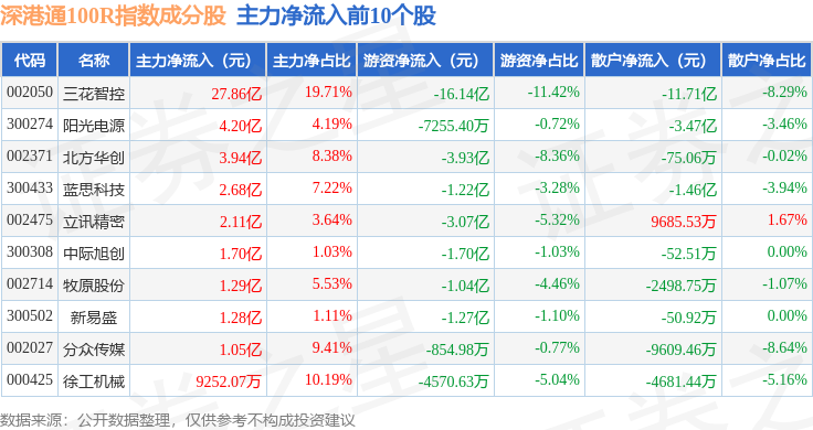 资金流向方面,深港通100R(483007)指数成份股当日主力资金净流入合计14.26亿元,游资资金净流出合计21.48亿元,散户资金净流入合计7.22亿元。成份股资金流向详情见下表: