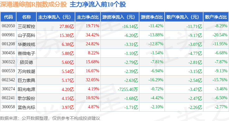 资金流向方面,深港通综指R(483005)指数成份股当日主力资金净流出合计195.52亿元,游资资金净流出合计14.03亿元,散户资金净流入合计209.55亿元。成份股资金流向详情见下表: