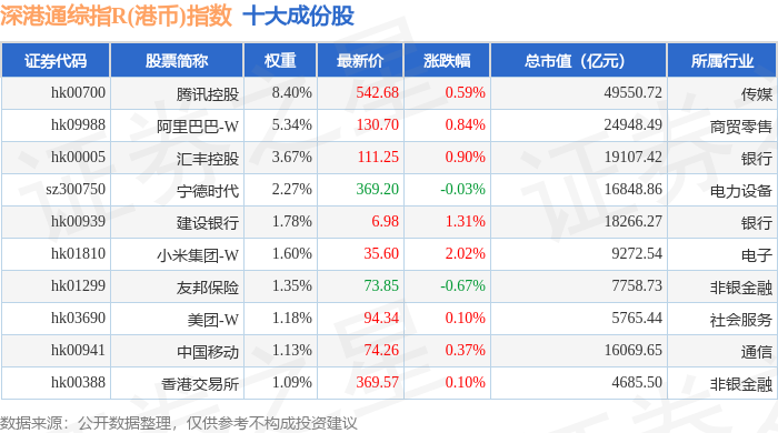 深港通综指R(港币)(483006)指数十大成份股详情如下: