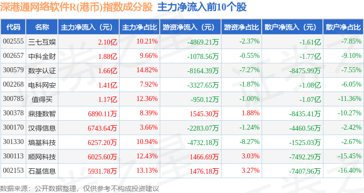 资金流向方面,深港通网络软件R(港币)(483048)指数成份股当日主力资金净流出合计9.48亿元,游资资金净流入合计8698.58万元,散户资金净流入合计8.61亿元。成份股资金流向详情见下表: