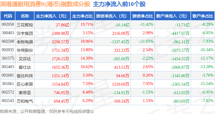 资金流向方面,深港通耐用消费R(港币)(483050)指数成份股当日主力资金净流入合计20.61亿元,游资资金净流出合计13.59亿元,散户资金净流出合计7.02亿元。成份股资金流向详情见下表: