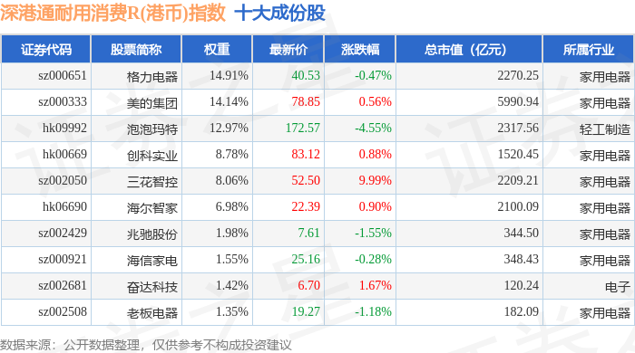 深港通耐用消费R(港币)(483050)指数十大成份股详情如下: