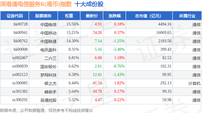 深港通电信服务R(港币)(483058)指数十大成份股详情如下:
