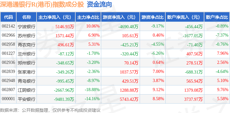 资金流向方面,深港通银行R(港币)(483082)指数成份股当日主力资金净流出合计6714.86万元,游资资金净流入合计3239.0万元,散户资金净流入合计3475.86万元。成份股资金流向详情见下表: