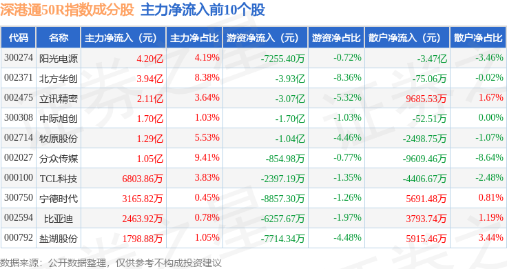资金流向方面,深港通50R(483091)指数成份股当日主力资金净流出合计9.98亿元,游资资金净流出合计2.36亿元,散户资金净流入合计12.34亿元。成份股资金流向详情见下表: