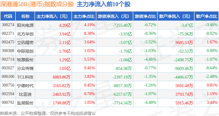 资金流向方面,深港通50R(港币)(483092)指数成份股当日主力资金净流出合计9.98亿元,游资资金净流出合计2.36亿元,散户资金净流入合计12.34亿元。成份股资金流向详情见下表: