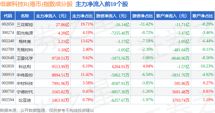 资金流向方面,低碳科技R(港币)(483161)指数成份股当日主力资金净流出合计17.05亿元,游资资金净流出合计6.54亿元,散户资金净流入合计23.59亿元。成份股资金流向详情见下表: