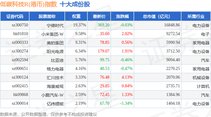 低碳科技R(港币)(483161)指数十大成份股详情如下: