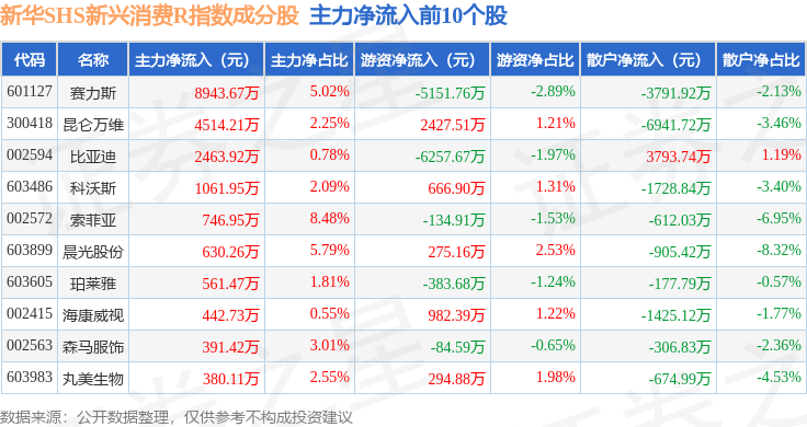 资金流向方面,新华SHS新兴消费R(489006)指数成份股当日主力资金净流出合计5.02亿元,游资资金净流入合计2.29亿元,散户资金净流入合计2.73亿元。成份股资金流向详情见下表: