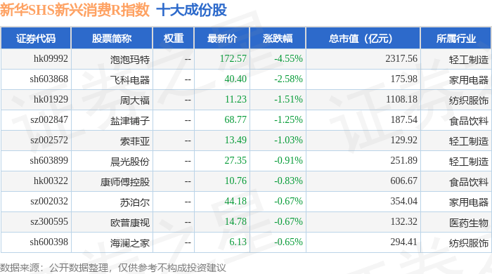 新华SHS新兴消费R(489006)指数十大成份股详情如下: