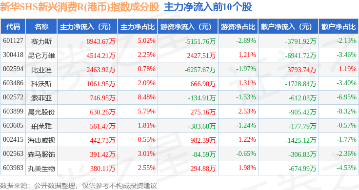 资金流向方面,新华SHS新兴消费R(港币)(489007)指数成份股当日主力资金净流出合计5.02亿元,游资资金净流入合计2.29亿元,散户资金净流入合计2.73亿元。成份股资金流向详情见下表: