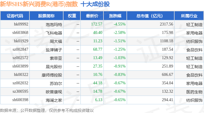新华SHS新兴消费R(港币)(489007)指数十大成份股详情如下: