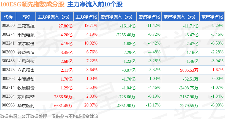 资金流向方面,100ESG领先(970030)指数成份股当日主力资金净流入合计22.53亿元,游资资金净流出合计26.8亿元,散户资金净流入合计4.27亿元。成份股资金流向详情见下表: