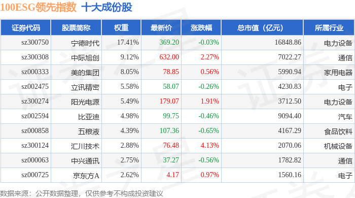 证券之星消息,12月30日,100ESG领先(970030)指数报收于6594.02点,涨0.68%,成交1207.9亿元,换手率1.26%。当日该指数成份股中,上涨的有23家,三花智控以9.99%的涨幅领涨,下跌的有26家,万科A以2.53%的跌幅领跌。