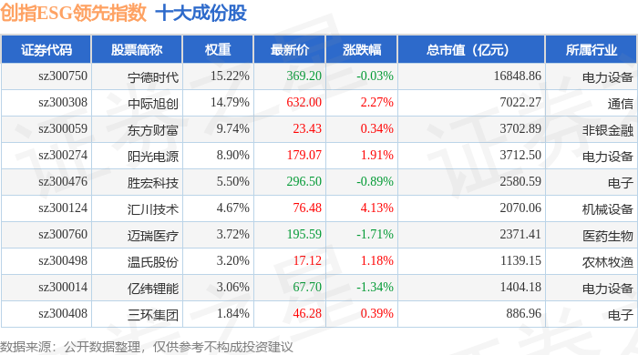 证券之星消息,12月30日,创指ESG领先(970031)指数报收于3557.04点,涨0.74%,成交984.27亿元,换手率1.9%。当日该指数成份股中,上涨的有23家,卓胜微以8.09%的涨幅领涨,下跌的有26家,迈为股份以6.44%的跌幅领跌。