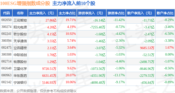 资金流向方面,100ESG增强(970033)指数成份股当日主力资金净流入合计23.39亿元,游资资金净流出合计21.08亿元,散户资金净流出合计2.31亿元。成份股资金流向详情见下表: