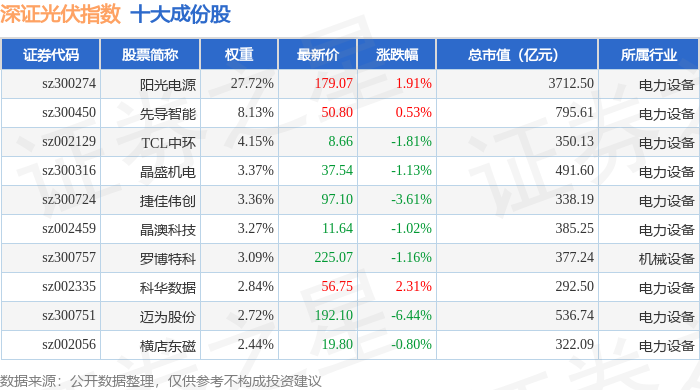 证券之星消息,12月30日,深证光伏(970035)指数报收于3729.45点,跌0.99%,成交375.65亿元,换手率3.01%。当日该指数成份股中,上涨的有11家,宇晶股份以3.09%的涨幅领涨,下跌的有37家,东方日升以8.35%的跌幅领跌。