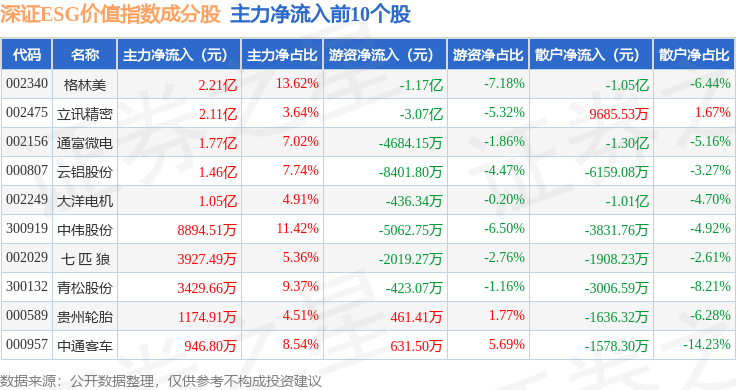 资金流向方面,深证ESG价值(970061)指数成份股当日主力资金净流出合计39.32亿元,游资资金净流入合计4.81亿元,散户资金净流入合计34.51亿元。成份股资金流向详情见下表: