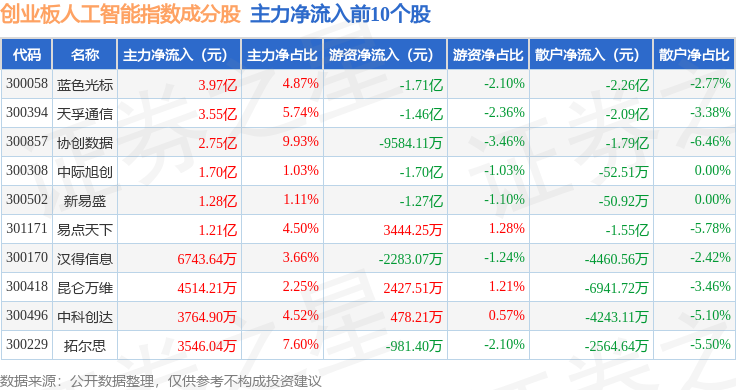 资金流向方面,创业板人工智能(970070)指数成份股当日主力资金净流入合计4.14亿元,游资资金净流出合计1.23亿元,散户资金净流出合计2.9亿元。成份股资金流向详情见下表:
