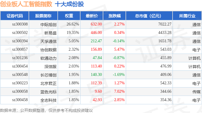 证券之星消息,12月30日,创业板人工智能(970070)指数报收于5954.14点,涨0.96%,成交884.83亿元,换手率5.67%。当日该指数成份股中,上涨的有30家,蓝色光标以7.02%的涨幅领涨,下跌的有19家,首都在线以2.43%的跌幅领跌。