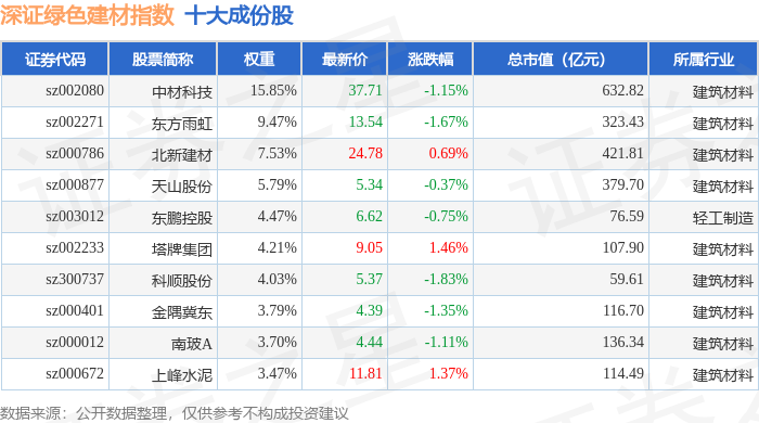 证券之星消息,12月30日,深证绿色建材(970077)指数报收于1360.83点,跌0.69%,成交67.26亿元,换手率1.71%。当日该指数成份股中,上涨的有4家,玉马科技以2.0%的涨幅领涨,下跌的有25家,沧州明珠以2.02%的跌幅领跌。