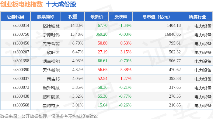 资金流向方面,创业板电池(970081)指数成份股当日主力资金净流出合计7.38亿元,游资资金净流出合计3.25亿元,散户资金净流入合计10.63亿元。成份股资金流向详情见下表: