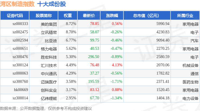 湾区制造(980009)指数十大成份股详情如下: