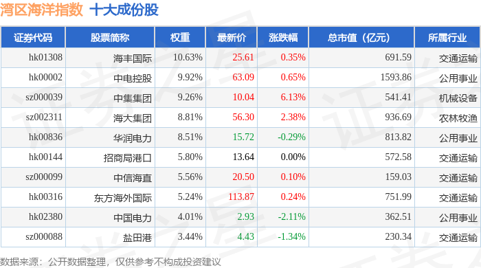 证券之星消息,12月30日,湾区海洋(980019)指数报收于1647.97点,涨0.32%,成交61.74亿元,换手率0.76%。当日该指数成份股中,上涨的有10家,中集集团以6.13%的涨幅领涨,下跌的有14家,中远海运港口以3.12%的跌幅领跌。