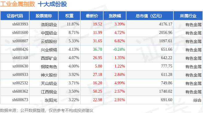 证券之星消息,12月30日,工业金属(980043)指数报收于3085.02点,涨2.04%,成交665.2亿元,换手率2.74%。当日该指数成份股中,上涨的有31家,云铝股份以6.82%的涨幅领涨,下跌的有19家,银邦股份以6.66%的跌幅领跌。