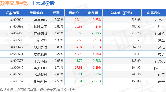 证券之星消息,12月30日,数字交通(980075)指数报收于3367.42点,涨0.45%,成交426.92亿元,换手率3.1%。当日该指数成份股中,上涨的有25家,振芯科技以8.39%的涨幅领涨,下跌的有25家,浙江世宝以10.01%的跌幅领跌。