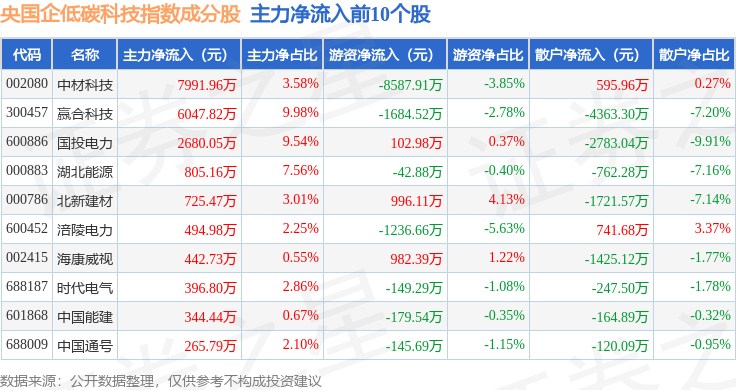 资金流向方面,央国企低碳科技(980082)指数成份股当日主力资金净流出合计38.56亿元,游资资金净流入合计9.65亿元,散户资金净流入合计28.91亿元。成份股资金流向详情见下表: