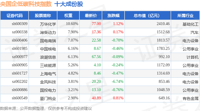 央国企低碳科技(980082)指数十大成份股详情如下: