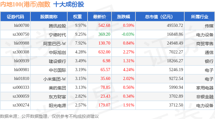 资金流向方面,内地100(港币)(983002)指数成份股当日主力资金净流入合计5.47亿元,游资资金净流出合计19.28亿元,散户资金净流入合计13.81亿元。成份股资金流向详情见下表: