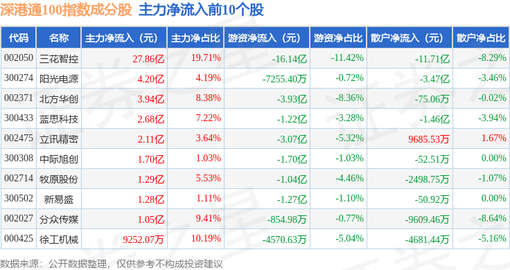 资金流向方面,深港通100(983007)指数成份股当日主力资金净流入合计14.26亿元,游资资金净流出合计21.48亿元,散户资金净流入合计7.22亿元。成份股资金流向详情见下表: