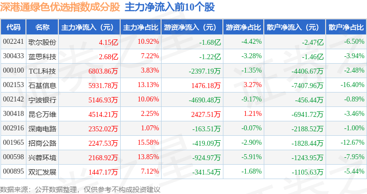 资金流向方面,深港通绿色优选(983011)指数成份股当日主力资金净流出合计46.45亿元,游资资金净流入合计11.81亿元,散户资金净流入合计34.64亿元。成份股资金流向详情见下表: