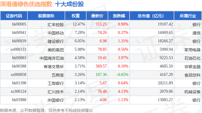 深港通绿色优选(983011)指数十大成份股详情如下: