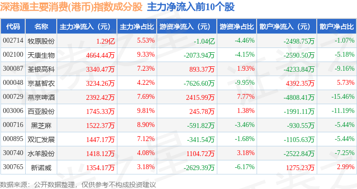 资金流向方面,深港通主要消费(港币)(983022)指数成份股当日主力资金净流出合计6.99亿元,游资资金净流入合计2617.52万元,散户资金净流入合计6.73亿元。成份股资金流向详情见下表: