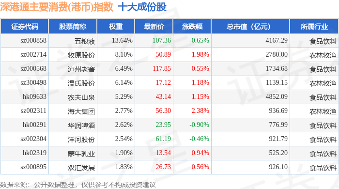 深港通主要消费(港币)(983022)指数十大成份股详情如下: