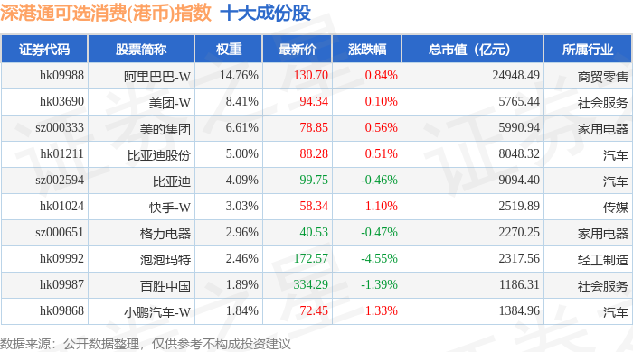 深港通可选消费(港币)(983020)指数十大成份股详情如下: