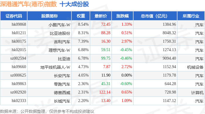 深港通汽车(港币)(983040)指数十大成份股详情如下: