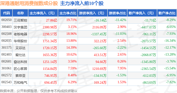 资金流向方面,深港通耐用消费(983049)指数成份股当日主力资金净流入合计20.61亿元,游资资金净流出合计13.59亿元,散户资金净流出合计7.02亿元。成份股资金流向详情见下表: