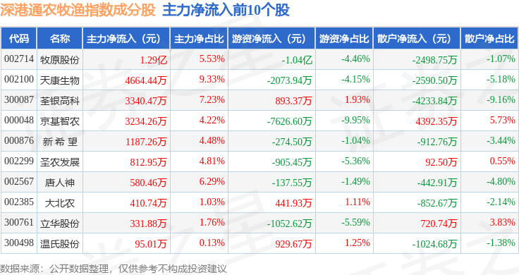 资金流向方面,深港通农牧渔(983051)指数成份股当日主力资金净流入合计1173.67万元,游资资金净流出合计1.54亿元,散户资金净流入合计1.42亿元。成份股资金流向详情见下表: