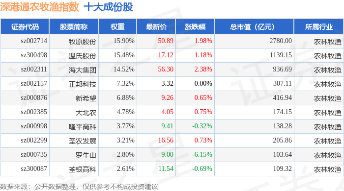 深港通农牧渔(983051)指数十大成份股详情如下: