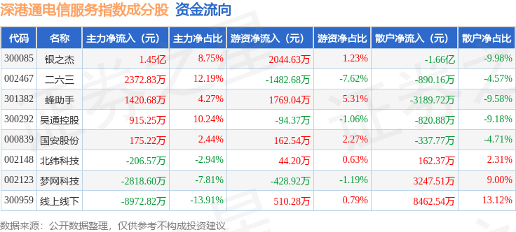 资金流向方面,深港通电信服务(983057)指数成份股当日主力资金净流入合计7427.12万元,游资资金净流入合计2524.74万元,散户资金净流出合计9951.86万元。成份股资金流向详情见下表: